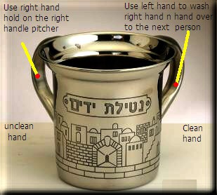 A Bowl and a two handled pitcher is traditionally used for the hand washing ceremony. The two handled pitcher derives from the concern over ritual purity during the time of the Second Temple. Since impurities were transmitted through contact, the two handled pitcher was developed as means of ritually cleaning the hands. Just as when a person is clean must not return or walk or do the ways of uncleanness or the old way or old nature that will redefile himself again.