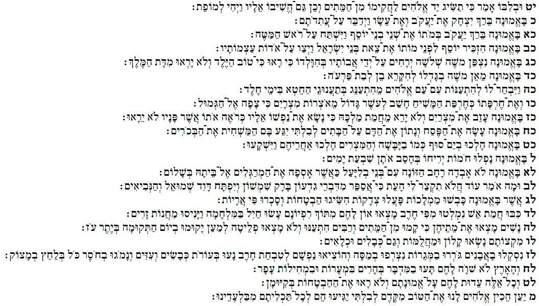 11:29 By emunah they passed through the Yam Sukh as by Yabashah: which the Mitzrites assaying to do were drowned.