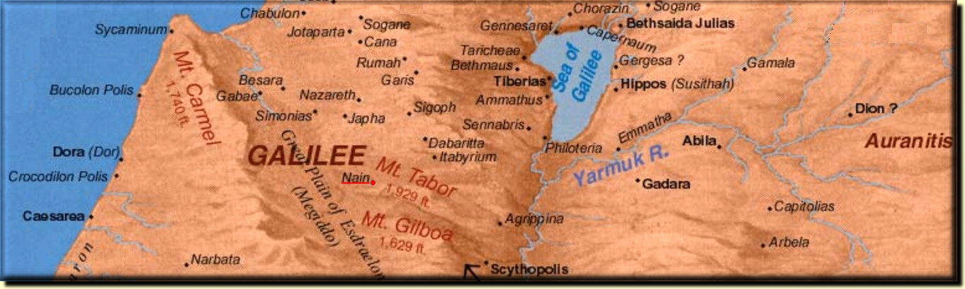 City of Na'im ( Hebrew: ניין beauty) was a small village about 6 miles SE of Nazareth, Eusebius (Onom 140:3) referred to it as Naeim, 12 miles S of Mount Tabor near Endor.