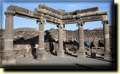 Chorazin (Hebrew: כורזים, Korazim; also Karraza, Kh. Karazeh, Chorizim, Kerazeh, Korazin ) meaning a furnacle of smoke - secrets, mystery. It was an ancient village in northern Galil, two and a half miles from K'far-Nachum on a hill above the northern shore of Yam Galil.The Babylonian Talmud (Menahot, 85a) mentions that Chorazin was a town known for its grain. Chorazin Geographic nature was a steep sun-exposed hillside, with its dark coloration tends to warm up in the springtime, much earlier than surrounding areas. Today this natural process is known as insoltation. The city prospered in the 2nd century a.d. when the region expanded with refugees from the Bar Kochba Rebellion. Khirbet Karâzeh (2031.2575), ca. 3 km. (2 mi.) NW of Capernaum, was first identified as Chorazin in the middle of the 19th century. The Israel Department of Antiquities and Museums conducted excavations there in 1962-65 and restoration work in 1982-86.