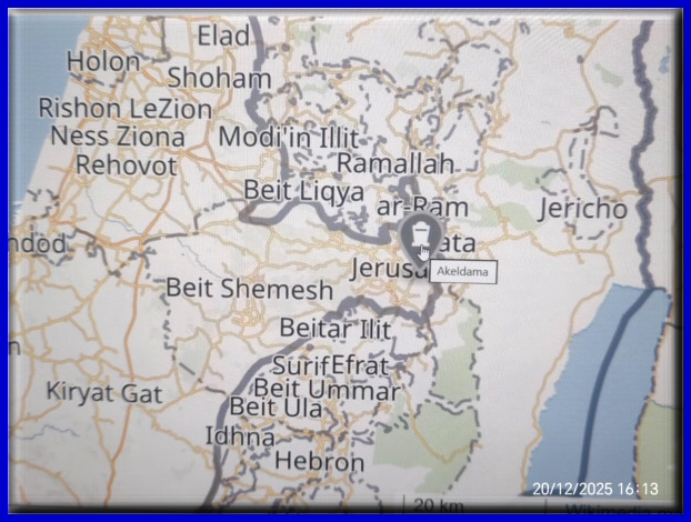 "Akel-Dama This is Greek Name Akeldamách Ἁκελδαμάχ and the Aramaic:- Khakal-Dema; דמא חקל field of blood is the Aramaic name for a place in Yerushalayim. The rocky cliffs and steep slopes of Mt. Zion, the Valleys of Hinnom and Kidron, and the village of Silwan spreading towards the Mt. of Olives.