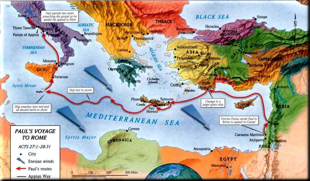 27:7 And when we had sailed slowly many days, and scarce were come over against Knidos, the wind not suffering us, we sailed under Krete, over against Salmone;