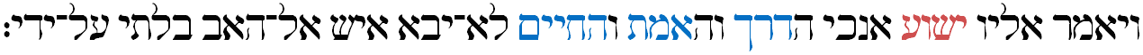 Vayomer elav Yehoshua anochi haderekh vehaemet vehachayim ve eesh lo-yavo el-haAv biltee al-yadi