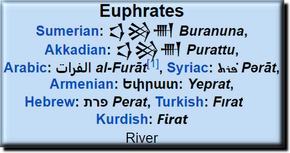 The Euphrates ; Sumerian: Buranuna, Akkadian: Purattu, Arabic: الفرات al-Furāt, Syriac: Pǝrāt, Armenian: : Yeprat, Hebrew: פרת Ferat, Turkish: Fırat, Kurdish: Firat) is the longest and one of the most historically important rivers of Western Asia.