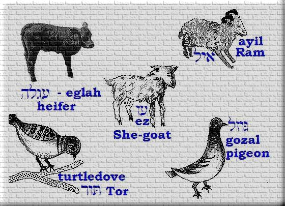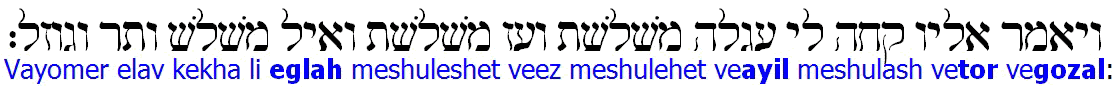 Take me an heifer(eglah) of three years old, and a she goat (ez) of three years old, and a ram(ayil) of three years old, and a turtledove (tor), and a young pigeon(gozal).