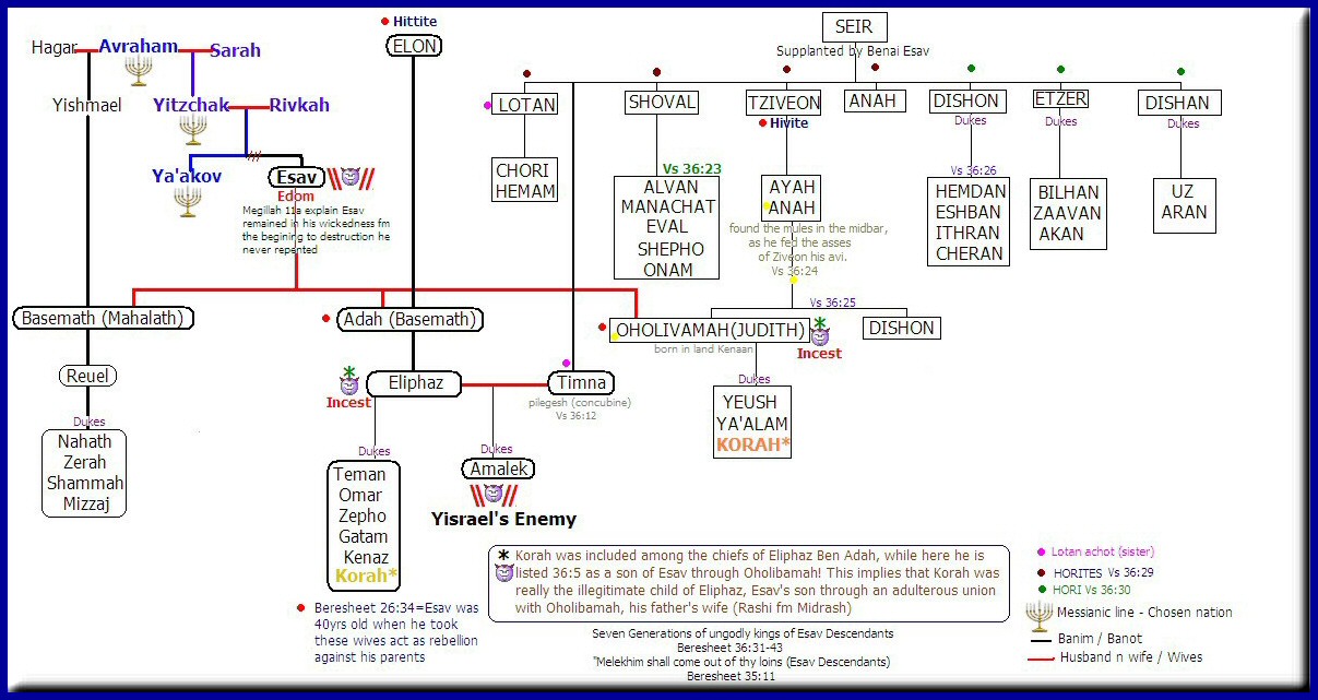 36:5 And Oholivamah bare Ye'ush, and Ya'alam, and Korah: these [are] benai Esav, which were born to him in ha eretz Kenaan.