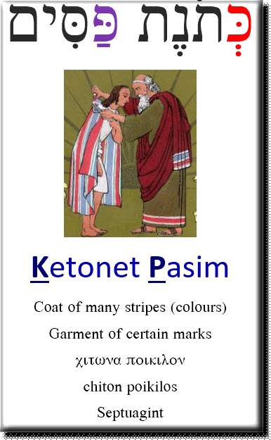 (ketonet/tunic reaching. to palms and soles) the multi-colored garments as Kotonet Pasim in Hebrew. The word translated as pasim means the palm of the hand and it is strips, denoting both a pattern of interwoven lines and different colors, In the shemetic tribe system the leader of the clan wears a long sleeved tunic in which ends of the sleeves are greatly belled.