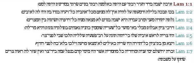 אֵיכָ֣ה׀ יָשְׁבָ֣ה בָדָ֗ד הָעִיר֙ רַבָּ֣תִי עָ֔ם הָיְתָ֖ה כְּאַלְמָנָ֑ה רַבָּ֣תִי בַגּוֹיִ֗ם שָׂרָ֙תִי֙ בַּמְּדִינ֔וֹת הָיְתָ֖ה לָמַֽס׃ ס