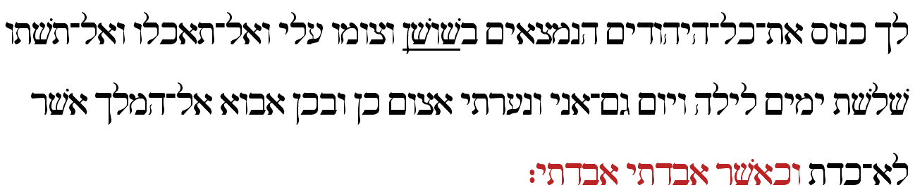 Lekh kenos et-kol-haYehudim hanimtzeim beShushan vetzumu alai veal-tokhlu veal-tishtu sheloshet yamim lailah vayom gam-ani venaarotai atzum ken uvekhen avo el-hamelekh asher lo-khadat vekhaasher avadti avadti: