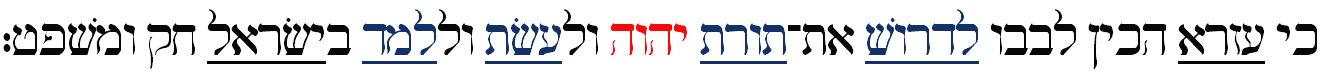 Ki Ezra hekhin levavo lidrosh et-Torat ADONAI velaashot ulelamed beYisrael khok umishpat: