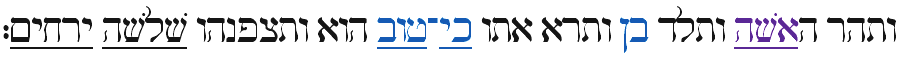 Vatahar haishah vateled ben vatere oto ki-tov hu vatitzpenehu sheloshah yerakhim: