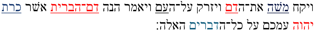Vayikakh Mosheh et-hadam vayizrok al-haam vayomer: “Hineh dam-ha be rit asher karat YHWH imakhem al kol-hadevarim haeleh:”