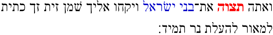 Veata tetzaveh et-Benei Yisrael veyikkhu eleikha shemen zayit zakh katit lamaOr lehaalot ner Tamid: