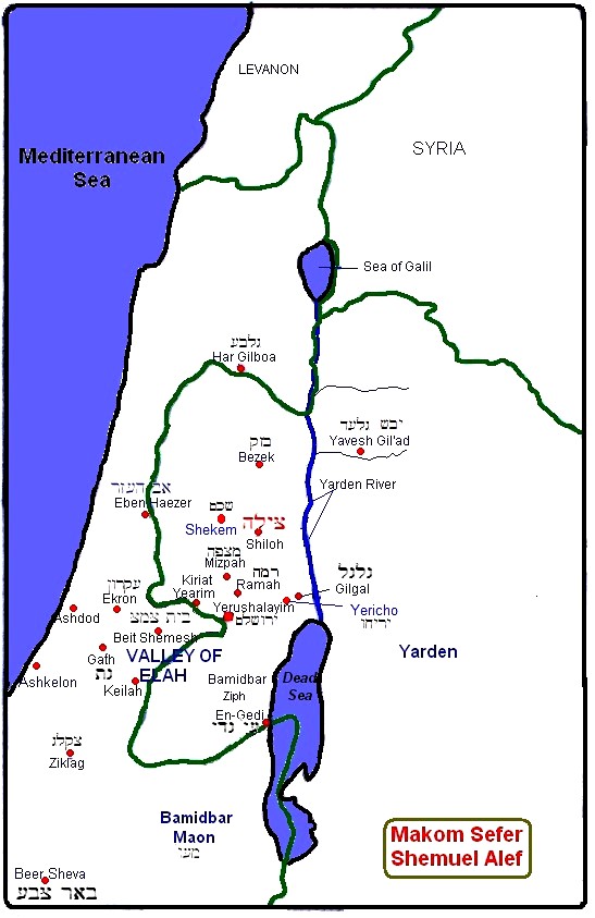 Ramah Shemuel birth place and burial; Shiloh The Focal poin of Yisrael's worship was at shiloh where the tabernacle and the Ark of covenant resided; Kiriat Yearim; Mizpah; Gigal valley of Elah, wilderness of Ziph, Mount Gilboa Ziklag