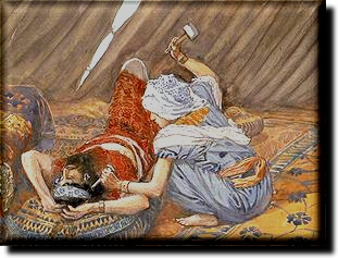 4:21 Then Ya'el Hever's wife took a nail of the tent, and took an hammer in her hand, and went softly to him, and smote the nail into his temples, and fastened it into the ground: for he was fast asleep and weary. So he died.