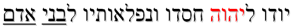 107:21 יוֹד֣וּ לַיהוָ֣ה חַסְדּ֑וֹ וְ֝נִפְלְאוֹתָ֗יו לִבְנֵ֥י אָדָֽם׃ ̇׆