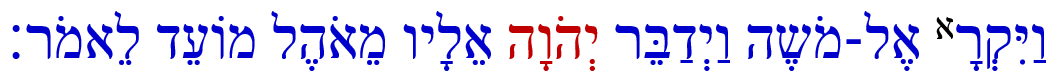 Vayikra el-Mosheh vayedaber Adonai elav meohel moed lemor: