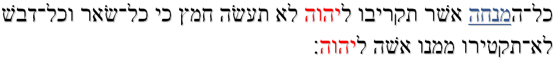 Kol-haMinkha asher takrivu laAdonai lo teaseh chametz ki khal-seor vekhol-devash lo-taktiru mimenu isheh laAdonai: