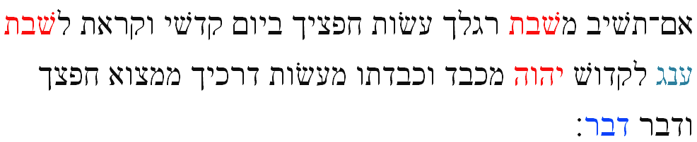 Im-tashiv mishabat raglekha ashoot khafatzeikha beyom kadshi vekarata laShabat Oneg likdosh ADONAI mekhubad vekhibadto mea`shoot derakheikha mimtzo kheftzekha vedaber Davar: